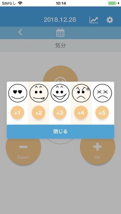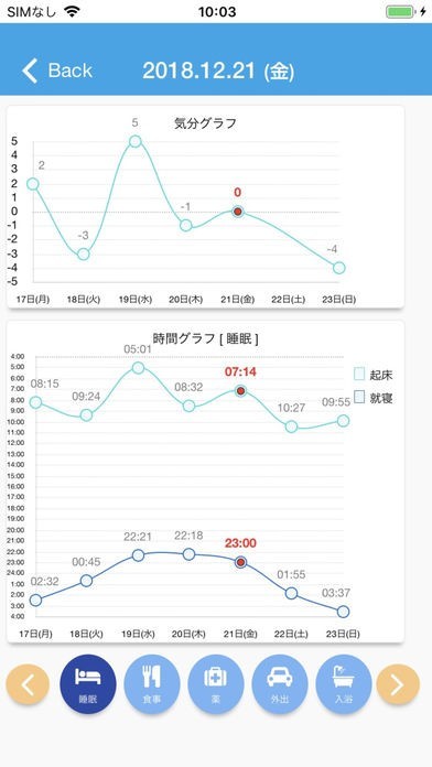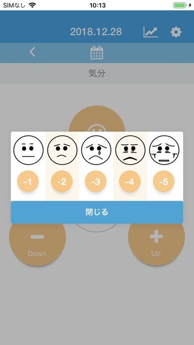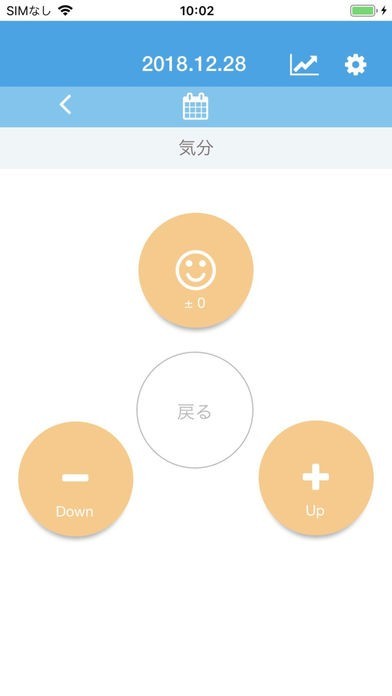 チャートでは自動的に線を繋げます。ですので鬱で辛い日や躁で記録が困難な日は記録しなくても大丈夫です。もちろん後日後追いで記録も可能です。「記録の行為」自体に負担を感じないで頂きたいことをコンセプトに設計しております。音も出しません。