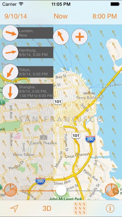 現在の昼夜だけではなく過去12時間から未来12時間までをシミュレーションすることも可能です。海外旅行で飛行機に乗るときに到着時刻にあわせれば、到着時の現地の昼夜を確認することができます。