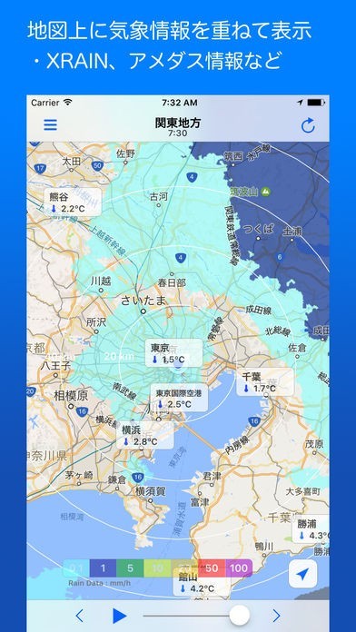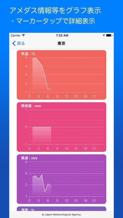 気象情報をいくつか重ねてより詳細に表示できたり、アメダスなど普段触れない情報をアプリで見ることができる。