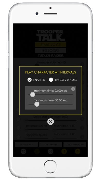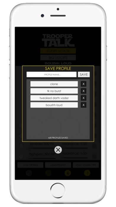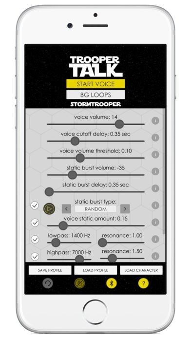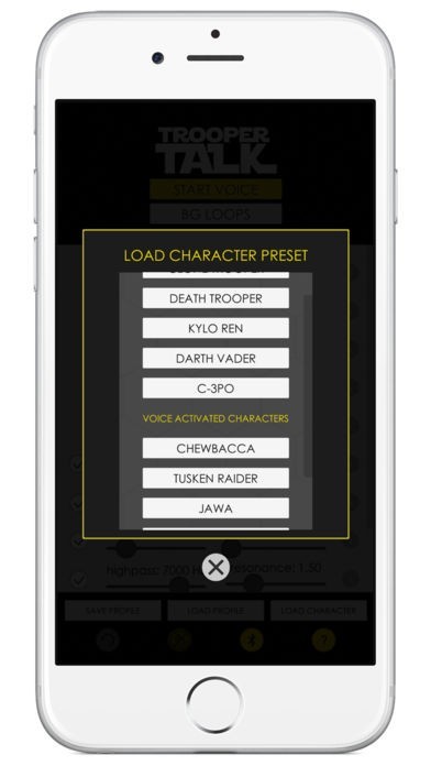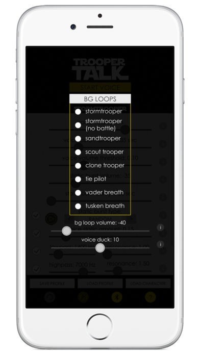 App Storeより引用TrooperTalk is a voice emulator designed for members of the 501st and Rebel Legions to use while trooping events. It is designed as an alternative to expensive voice changer boxes such as the iComm, Rom/FX, etc, but also to be flexible enough to allow emulation of many of your favorite characters. Simply plug in a mic/speaker splitter to your device, attach your mic and amp and you are ready to sound like your favorite Star Wars character!