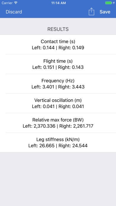 -Calculate contact time, flight time, frequency, max force, displacement of the center of mass and leg stiffness with scientific accuracy