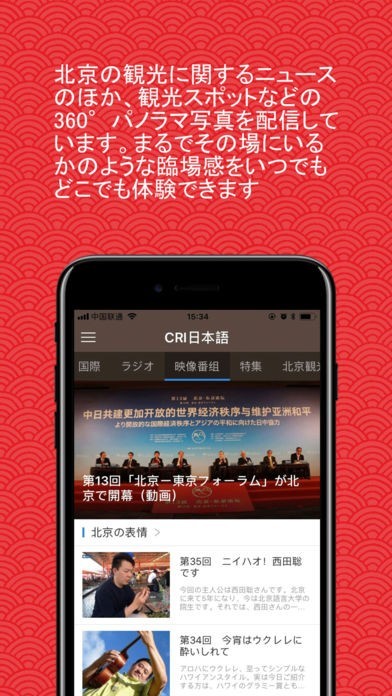 このアプリでは、中国の首都北京に住む一般市民の生活の様子を写した番組や、中国で仕事をしている日本人についての番組など、実際に中国で暮らしている人々についての内情を詳しく知ることができます。