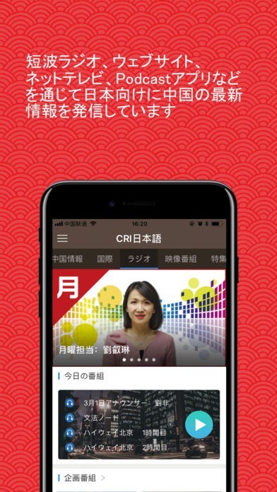 このアプリでは、中国人パーソナリティが日本語で中国に関するさまざまな話題を取り上げているラジオ番組や、初心者から上級者まであらゆる人に対応している中国語講座を聴くことができます。