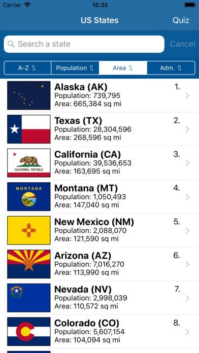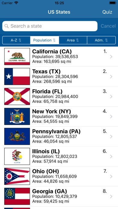 Search directly for a state with the search bar or easily sort all states by population, area or date of admission.