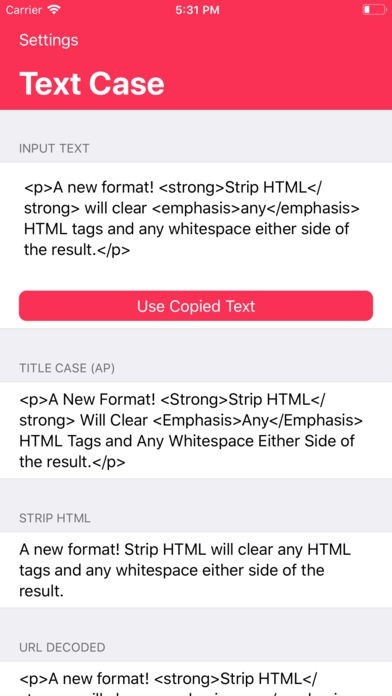 It comes packed with an action extension that lets you select text anywhere in iOS, tap the Share button, and then you’ll find the “Convert Text” action. This will show you a preview of all available formats, and a simple tap on one of those will copy it to your clipboard, and you’ll be returned to the original app.