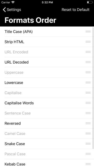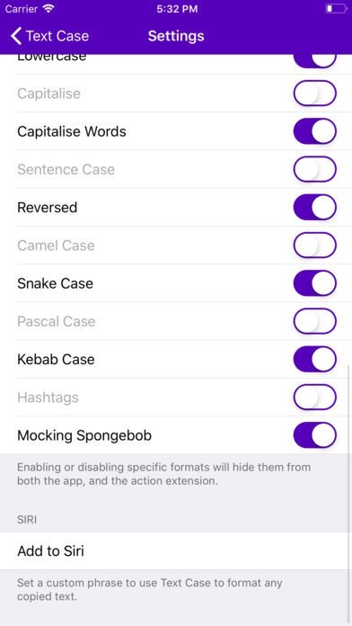 All formats are available to be used with Siri Shortcuts. Every time you copy or share the result of a text conversion, iOS will be made aware and can suggest these actions to you in the future. You can also manually add a format to Siri by going tapping on Settings, and then the "Add to Siri" button at the bottom.