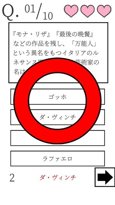 画面上部にはハートが3つ表示されており、すべてのハートがなくなってしまうまで問題を間違えることができます。ライフの残量に応じて戦略的にクイズに解答することもできます。