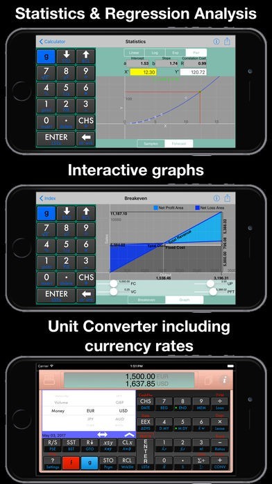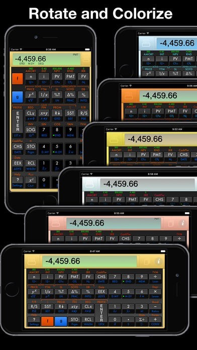 •Views for all orientations: Portrait and landscape renderings of the full keyboard are provided for iPhone and iPad. The iPad version includes slide over and multiple split view displays as well as side-by-side display of the help page, audit tape, tvm mortgage table or program variables.