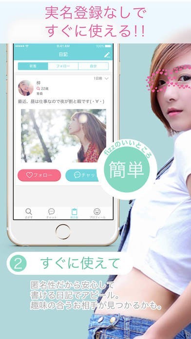ニックネームなどの情報を簡単に入力するだけで、すぐに利用を始めることができます。チャットでのトークや日記など全ての機能を無料で利用できるので誰でも気軽に恋活ができちゃいます。