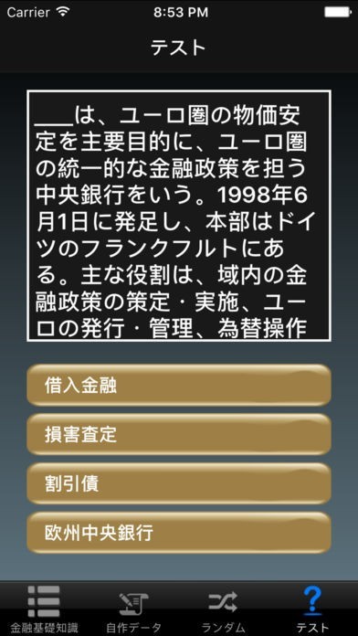 テスト機能がついており、4択問題のクイズであなたの金融知識を確認することが出来ます。空いた時間にクイズを楽しみながら少しずつ金融知識を覚えたいと言う人にもおすすめです。