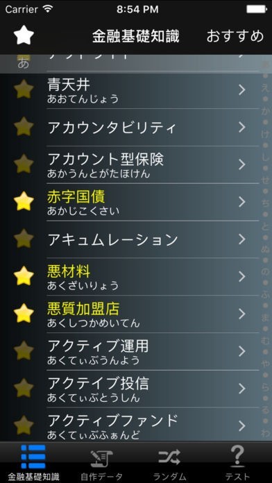金融基礎知識の項目では五十音順に用語が整理されており調べたい用語がすぐに見つかります。気になる用語は星ボタンを押すことでチェックでき、黄色で表示されるので見たいときにはすぐに確認できます。