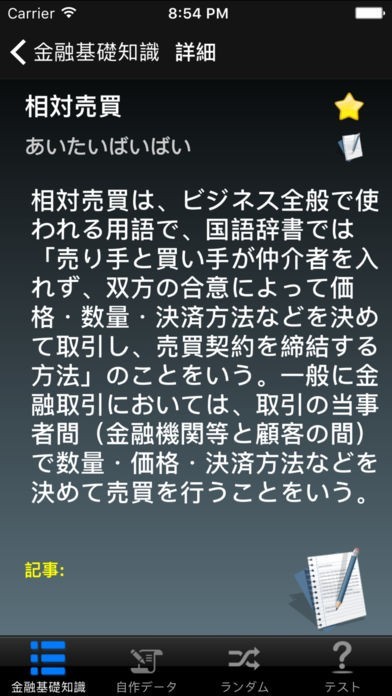 総勢2400を超える金融関連業界ワードや基礎知識を掲載。左端に星マークがあり、その横に専門用語が記載、縦に列挙してあるという表示形式。そのうち1つをタップすると詳細な説明画面へと遷移します。