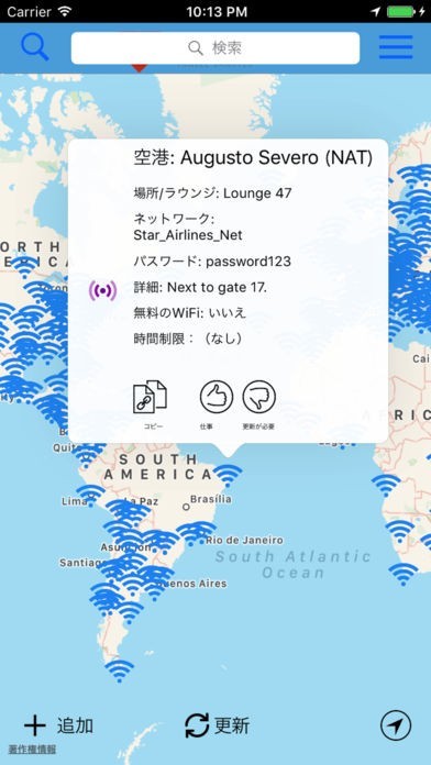アプリの地図にはWi-Fiが使える世界中の空港が表示されます。今いる空港、これから訪れる空港を地図上で探してみましょう。Wi-Fiマークをタップでパスワードをすぐに表示できます。