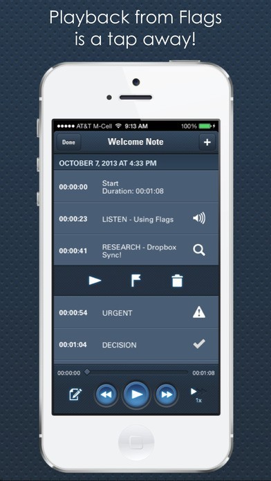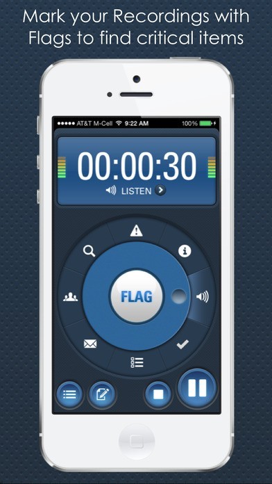 While recording, a simple tap allows you to quickly and easily mark significant points with audio markers called "Flags". There are two standard flag sets for business and education users, with Flags such as "Urgent", “Listen”, “Research”, and "Test Item". If the standard Flags don’t suit your needs, you can create your own custom flag sets with names and icons that make sense to you. During playback, you’ll see the Flag markers and can immediately start playing from those moments of the recording. Jump to the most important information quickly and easily!