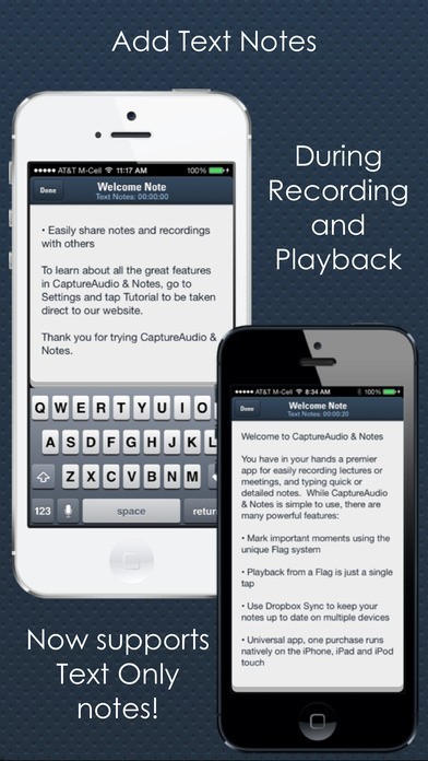 Universal support for Audio Recordings with precise time marking using our heralded Flags system, and you are now able to enter typed text notes independent of audio recording. Delivering much greater levels of efficiency and productivity when you record important lectures, meetings and other events, CaptureAudio & Notes incorporates the sophisticated marking system and text notes to audio recordings. Simple to use, yet very powerful. If you use your iPad, iPhone or iPod Touch for recording, you need CaptureAudio & Notes!
