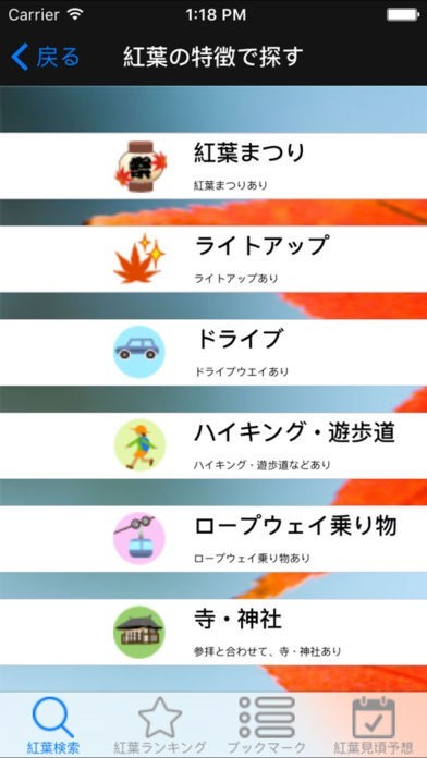 条件付き検索ができ、目的に合わせた紅葉が綺麗な場所を探すことができる