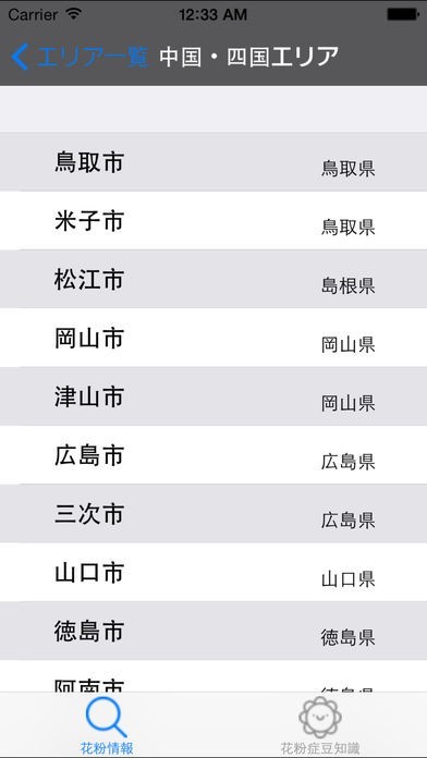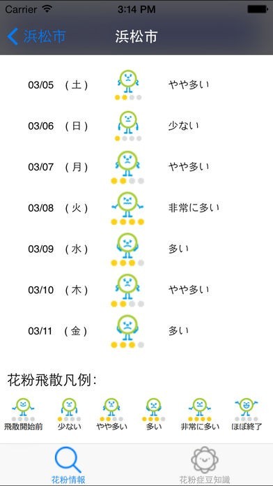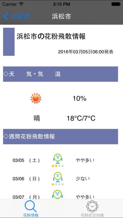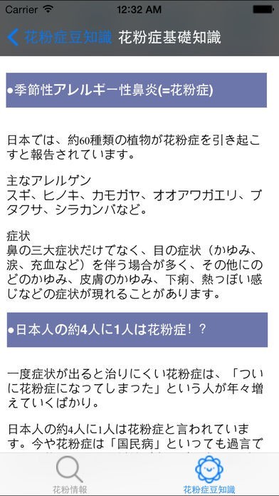 地域別に花粉予測が閲覧出来るので、自宅や勤務地周辺のデータも簡単にピックアップしていけます。また「花粉症豆知識」が収録されているため、花粉症やアレルギーに関する情報を細かく調べたい時に重宝しますよ。