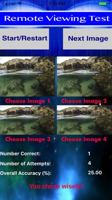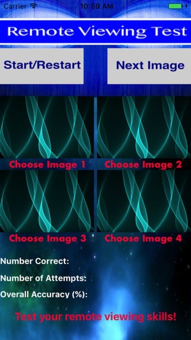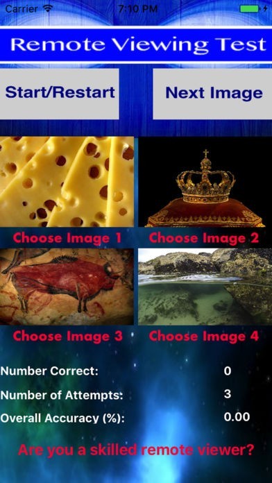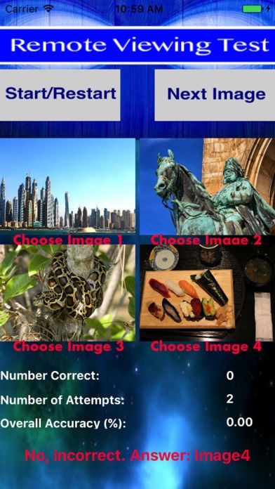 このアプリは世界中に存在する、潜在能力を持つ超能力者を発見する目的で作られました。4つの画像が表示されるので、その中から一つ選んでみて下さい。ボタンを押せば、正解の画像が表示されます。