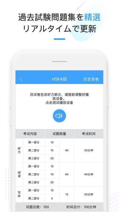過去問題の他に、聴く、読む、作文、間違いやすい問題、難題などをバランスよく出題する模擬試験モードにも挑戦することができます。模擬試験を解くことで、より実践的な試験対策が可能となります。
