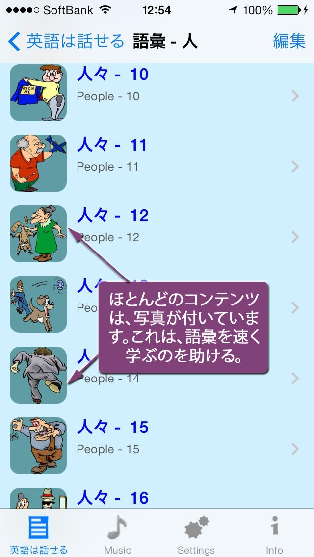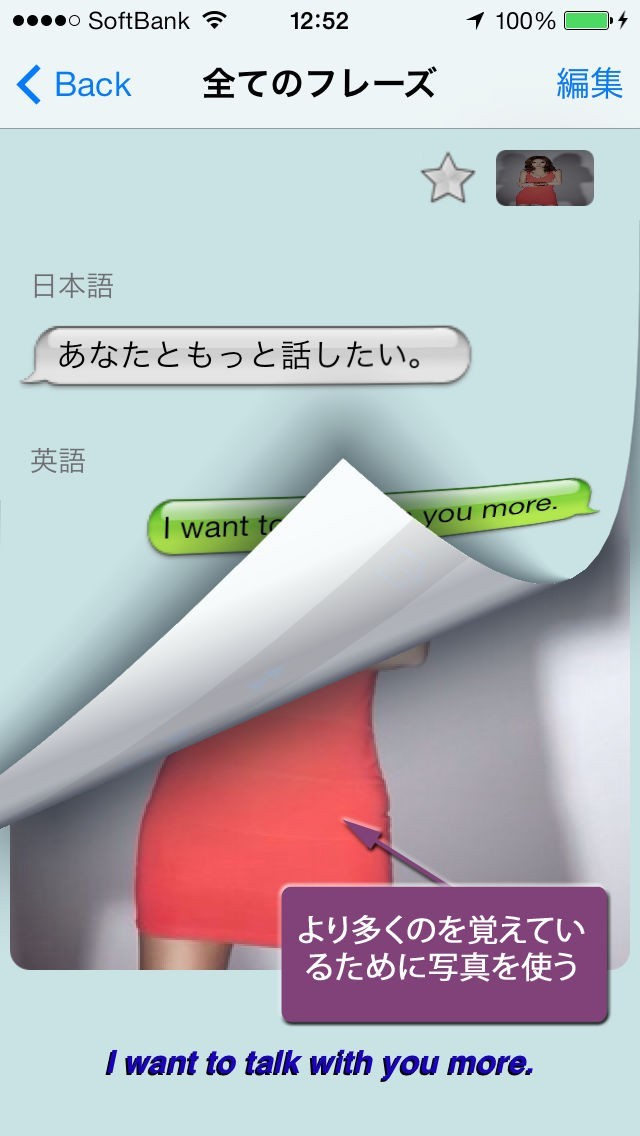 旅行や生活、恋愛などのカテゴリーに分類されているのでフレーズを見つけやすく使用シーンも分かりやすくなっています。それぞれのカテゴリーやフレーズには覚えやすい写真を独自に登録できます。
