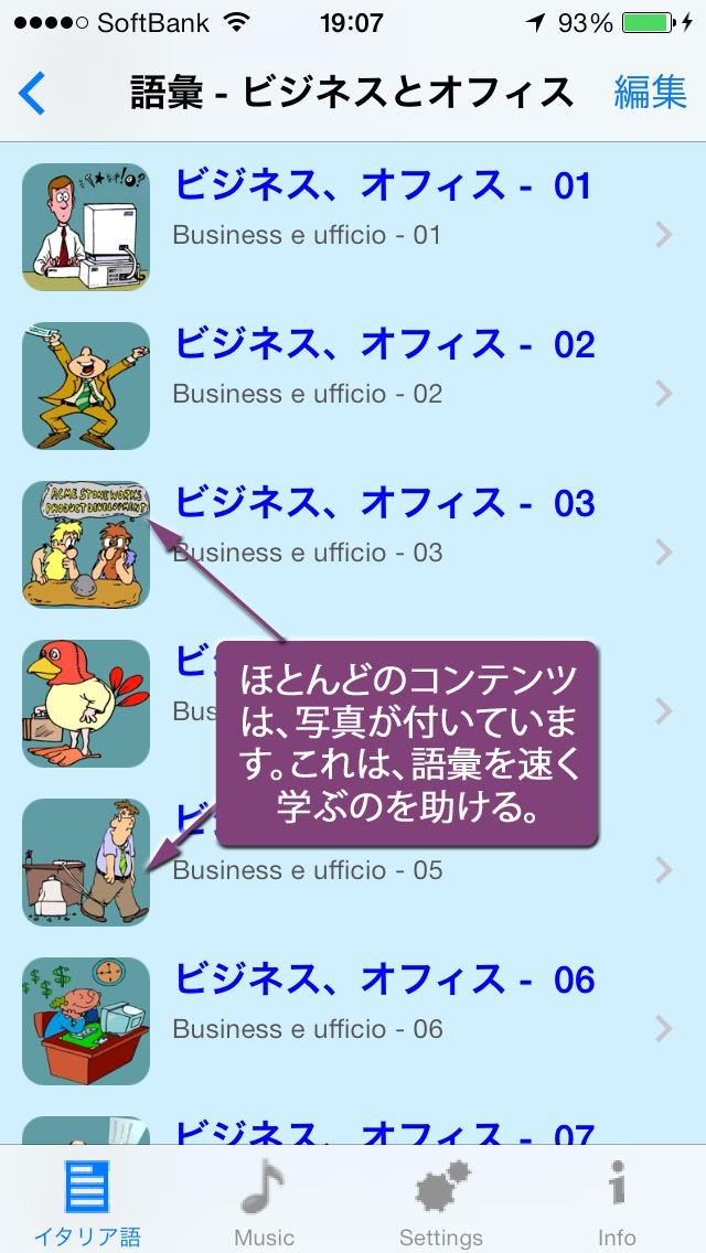 • 暗記したり意味を思い出だしたりする手助けとして、カテゴリーとフレーズに写真を付ける機能。