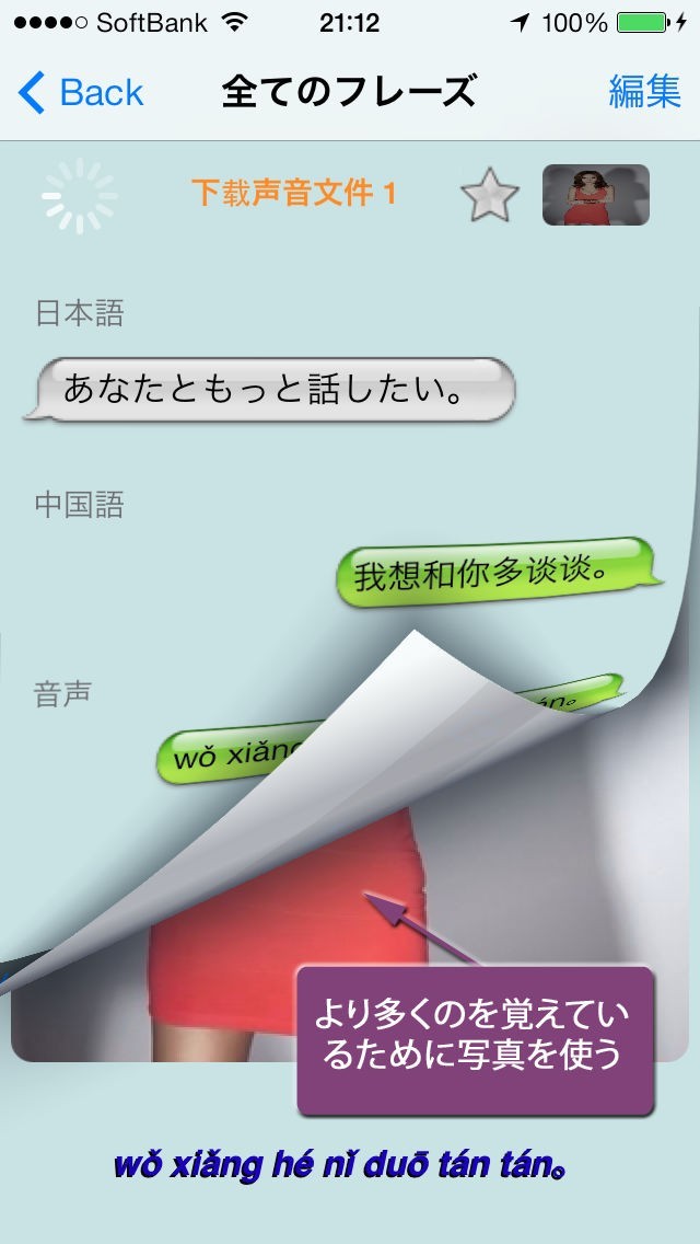中国人がよく使用するフレーズが場面ごとに登録されています。その数は3000種以上で、音声付きなのは2500種も。登録されていない言葉も、自分で追加・編集・削除が行えます。友達の話した言葉を録音して、そこから登録することも可能ですよ。