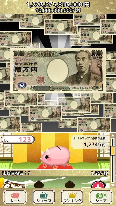 「秒で100億円」は画面をタッチする事でどんどんお金を増やしていけるカジュアルゲームで、貯めたお金を使って様々なアイテムを購入出来る特徴があります。貯金箱にお金を移すことでレベルアップしていく事が可能ですし、1回のタップ操作で貰える金額を増加していけるのが機能の特長でしょう。「長者ランキング」で全国のユーザーと資産対決出来るのもアプリの面白い点です。またお金を増やすだけでなく泥棒を退治出来るアクションが追加されているので、通勤中等の暇つぶしにも最適です。