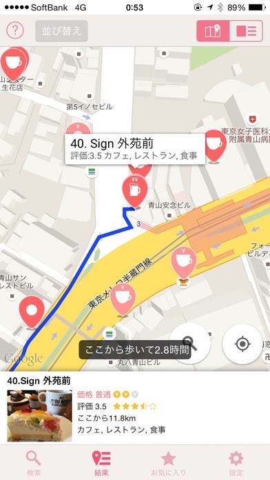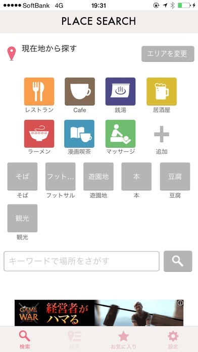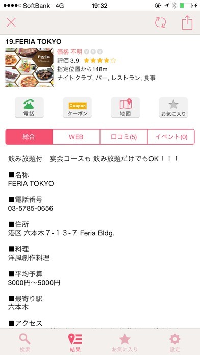 「PLACE SEARCH」では、検索によって、条件を指定してお目当てのお店を発見し、マップ上に表示しそこまでの行き方を示してくれます。 よって、土地勘がないような方でも安心して店まで行けます。 「結果」タブではお店の詳細な説明を見ることができ、クチコミなどの情報を得ることが出来るだけではなく、電話で連絡をとることもでき、さらにはクーポンを利用してお得に飲食することも可能になります。 その中で気に入ったものは右端の星マークをタップすればあとからでもお気に入りタブでまとめてチェックすることが出来ます。