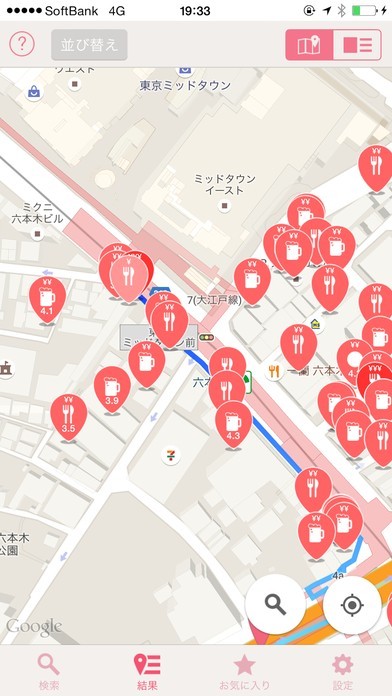 検索によって、条件を指定してお目当てのお店を発見し、マップ上に表示してくれる