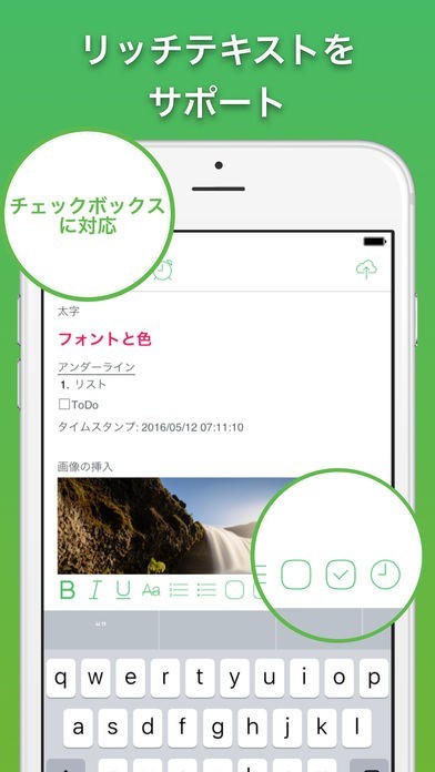 長文入力がスムーズにできるのはもちろんのこと、フォントの変更や色の変更、太字への変更など、外出先でもリッチテキストを使用した編集がスマホでカンタンにおこなえます。