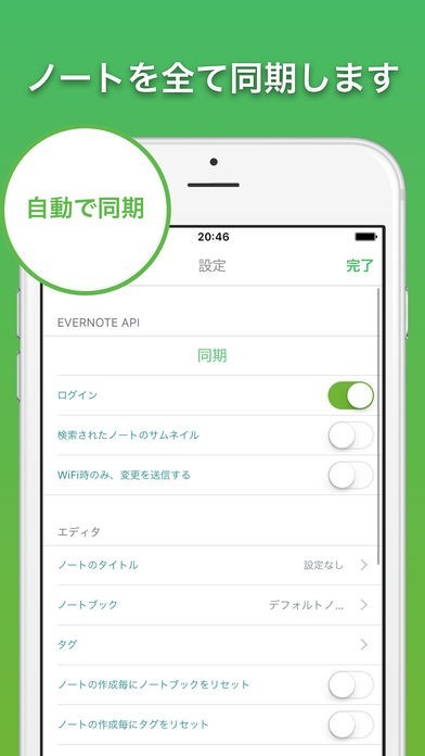 作成したテキストデータをアプリ内に保存できるのはもちろんですが、Evernoteに作成内容を反映させたり、複数の他のデバイスからログインして同期させたりできます。