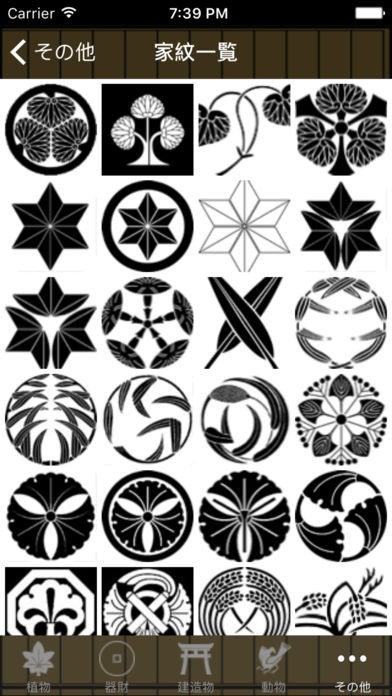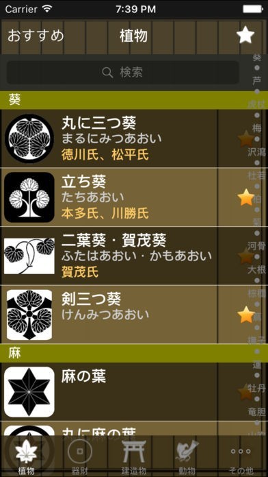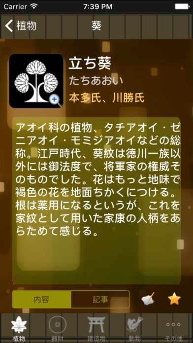家紋辞典は450もの家紋を収録しており、図柄の確認はもちろん、それぞれの家紋について使用していた家柄やモチーフとした植物などの解説などが読めるようになっており、家紋に詳しくなれます。