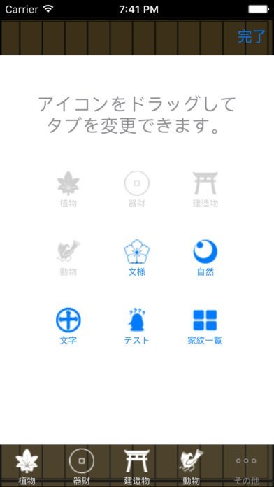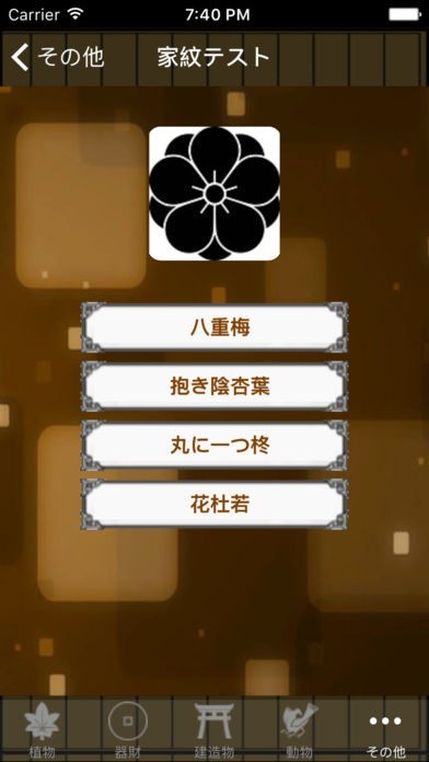 家紋辞典では、家紋の一覧などの表示に加えて、家紋に関する問題が出題されるテストモードも用意されており、家紋の絵柄や名前に関して特に強くなれる点でおすすめの機能です。