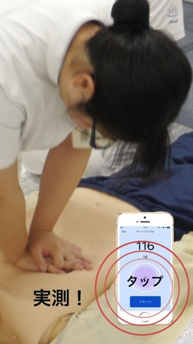 チェックモードがあり、胸骨圧迫のリズムに合わせて画面の中央をタップすることでリズム、回数が表示される