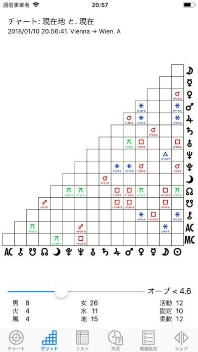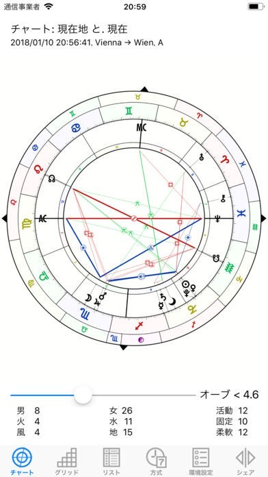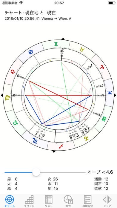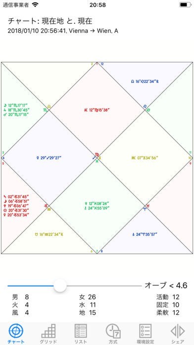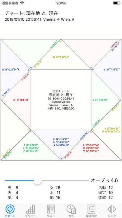 12サインと13星座のゾディアックを表示します。天体の天文暦は、太陽や月、水星などです。小惑星と天体は、キロンやフォルス、ネッススなどがあります。天体位置やハウスカスプがわかり便利に使えます。