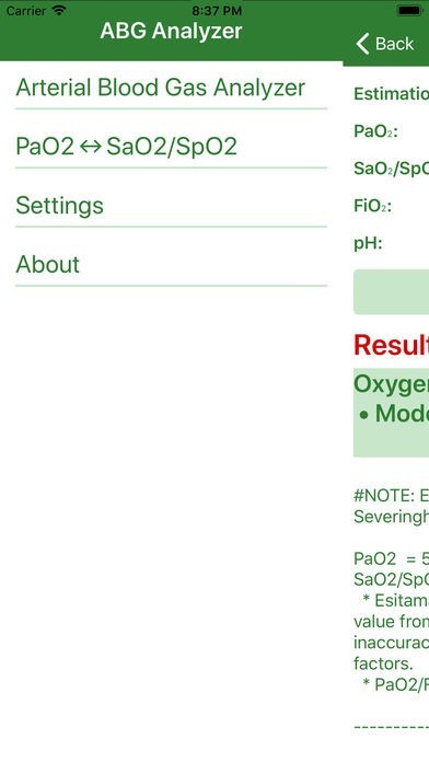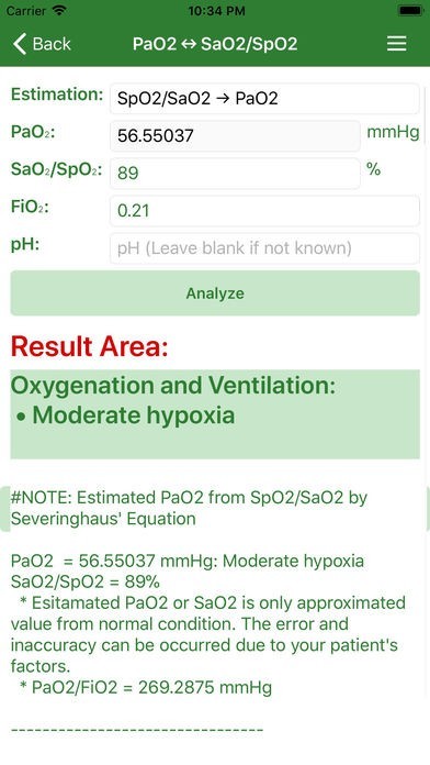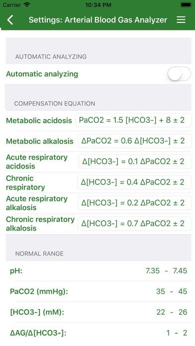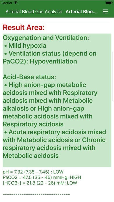 App Storeより引用The Arterial Blood Gas Analyzer (Pro) is the mobile application that helps to interpret the result of arterial blood gas. Its function are comparing the result with normal range, showing the A-a gradient, calculating the compensatory degree, and explaining the interpreted results. Moreover, the application user can set the custom normal ranges, the cut-off values, and the compensation equation.