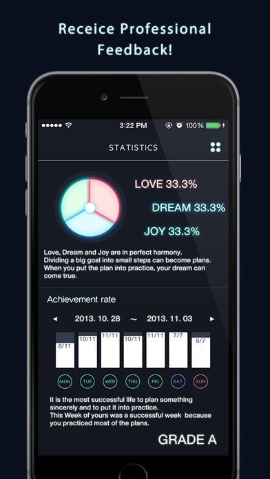 作成したスケジュール表のラブ、ドリーム、ジョイのバランスがよくとれるかどうかを評価してくれ、いくら一週間の計画をよく実践したのかをフィードバックしてくれます。