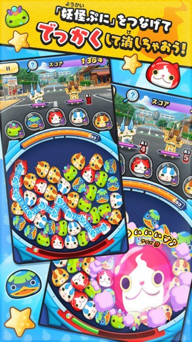 「妖怪ぷに」と呼ばれる、それぞれの妖怪を模したアイコンを、同じもの同士を繋げることによって、高得点につながります。「でかぷに」と呼ばれるものは、ハイスコアのチャンスです。