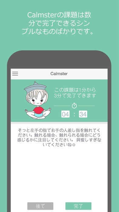 あなたにとって可能な方法で瞑想とマインドフルネスを訓練することにより、より安定し幸福感を感じることができるようになります。Calmsterはあなたがアプリに依存することなく、あなたを手助けできるように作られています。スキルとテクニックを教えることであなたがあなたの生活の中で実践することができるようになります。今すぐにより良い生活を始めませんか。お使いの携帯電話にCalmsterをインストールしましょう。