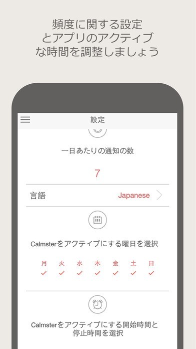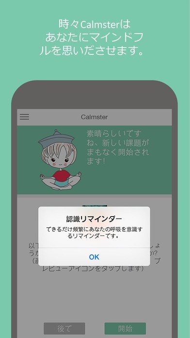 精神的な障害のほとんどは意識的なコントロールが不足しているために起こります。それはたいていの場合、相互に矛盾した無意識のパターンが私たちの気分や行動に影響を与え始めます。これに対する解決策は簡単です - 常に今に集中するように意識をトレーニングしどのようにそのパターンが働くか、いつ起こるかに気づくことです。本質的に瞑想とマインドフルネスの実践は、まさにそれを行うために設計されています。 Calmsterではアプリで設定した頻度に応じ一日を通じてあなたの携帯電話に瞑想の課題とマインドフルネスの通知を送信します。これらの課題とリマインダによりあなたが今ここに集中することに役立ち、あなたの気分や行動に対し不快な意識パターンを残さないようにします。