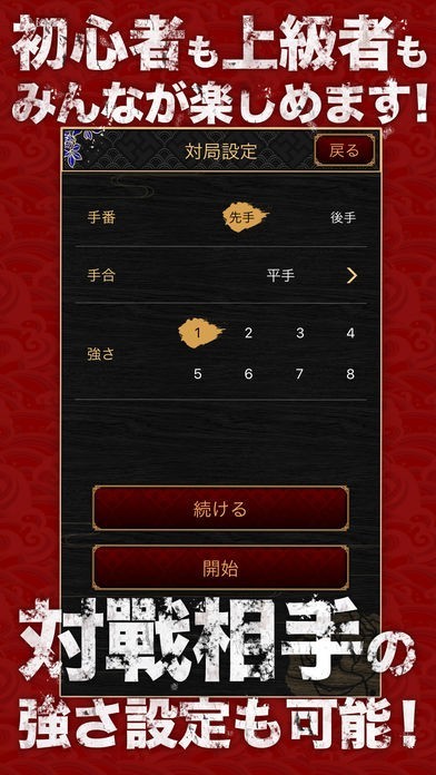 対局相手のコンピュータは強さ設定が可能で初心者でも楽しめるレベル1から上級者も満足できるレベル10まで選択できます。自分のレベルに合った強さのコンピュータと対局を重ねれば、経験が積めて将棋の腕を磨くことができます。