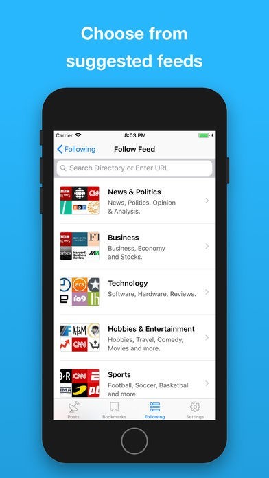 You'll find feed recommendations in multiple categories to help you get started (news, tech, business, arts...).