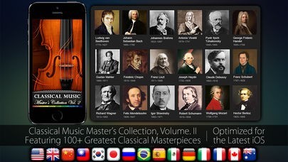 「クラシック音楽 II」は無料で70カ国以上のクラシックを聴くことができるアプリです。収録されている曲ははなんと110曲!全てオーケストラで演奏された音源なので、本格的なクラシックを楽しめます。普段聞きなれた曲から珍しい曲まで、様々なクラシックを収録、曲は作曲者や国別に表示可能なので、お目当ての曲がすぐにみつかります。ループやシャッフル、プレイリストといった機能も充実、非常に使いやすい音楽プレーヤーです。また、web接続をすればYoutubeも利用可能、映像と一緒にクラシックを楽しめます。気に入った楽曲はワンタッチ、iTunesから購入することも可能です。