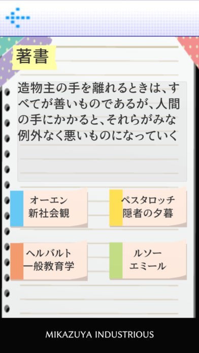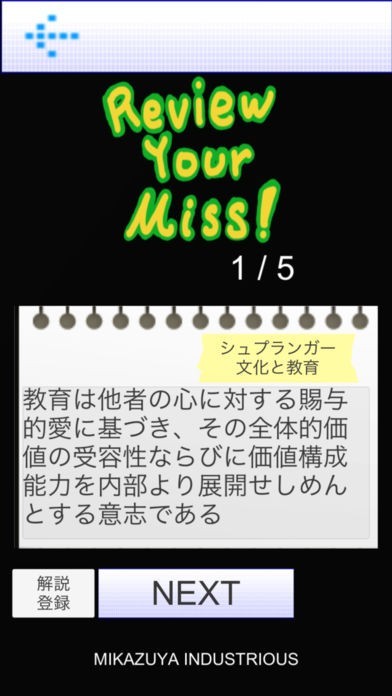 App Storeより引用教員を目指す全ての人に向けた、教職教養の学習アプリです。2つのモードを搭載しています。著書編では、内容を元にその人物と著書名を、理論編では唱えた理論を元にその人物名を答えます。不正解すると学習指導要領解説の内容を交えた解説が表示されます。また、カレンダーによって日々の学習記録が自動で作成されます(午前・午後別)。さらに、設定によるリマインドが可能で、1日最大2回の通知を端末に送ることができます。