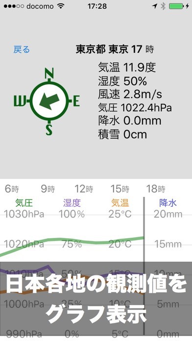 アメダス画面は全国の気象観測地点の雨量や気温、気圧の推移をグラフ表示します。