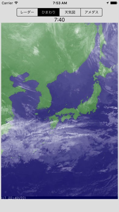 このアプリではレーダーと気象衛星の雲画像をアニメーションさせ、雨の予想がしやすいようにしています。