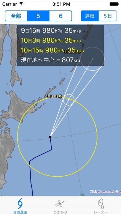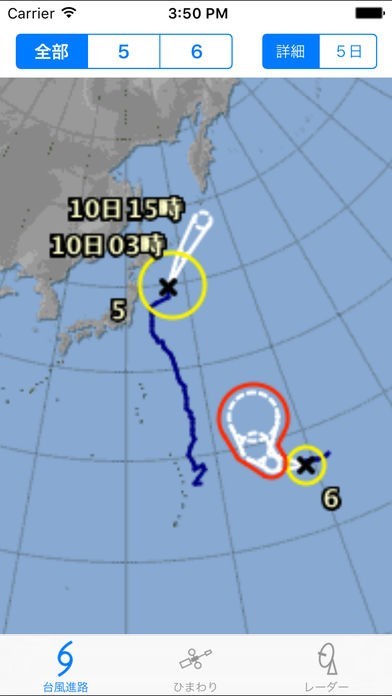 気象庁は5日先までの予想進路を発表する時には、同じようにアプリ内で5日後までの進路を知ることができます。タブを切り替えるだけと簡単なので、初めての方でも使いこなせます。