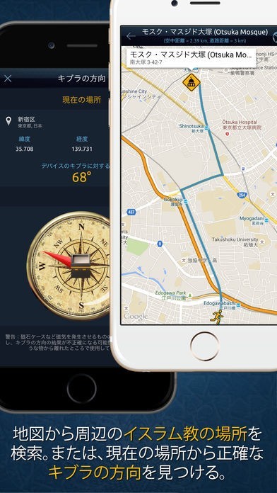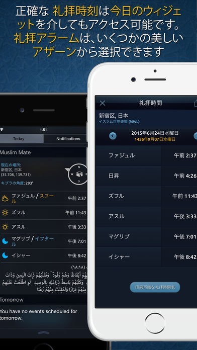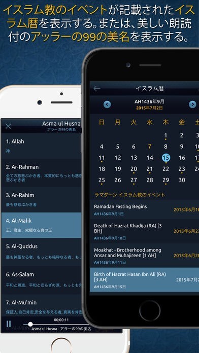 現在地点から礼拝を行う時刻や方角を割り出します。アラームでの通知を設定できますし、音は複数から選べる。イスラム教に関する行事をチェックできるため、忘れる事なく参加ができます。