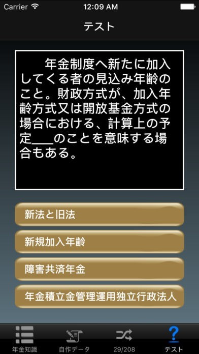 このアプリには勉強した年金の知識に関する問題をしてくれる「テスト機能」がついているので、テスト感覚で楽しく学べます。自分では覚えたつもりでも、こういった形式で出されると意外と間違うことも多いです。