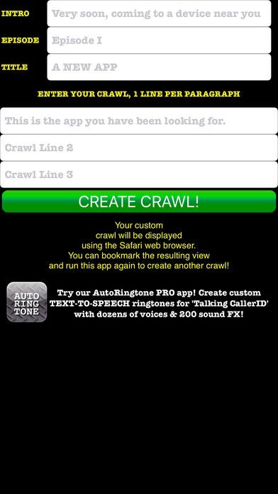 App Storeより引用THIS IS THE APP YOU ARE LOOKING FOR! Create your own custom scrolling message using your iPhone, iPod touch or iPad! Type an INTRO, EPISODE & up to 3 paragraphs of a custom message. Create your "crawl" and watch it using the Safari built-in web browser. Bookmark the resulting page & view it anytime in Safari on your iPhone, iPod touch, iPad or even Mac!